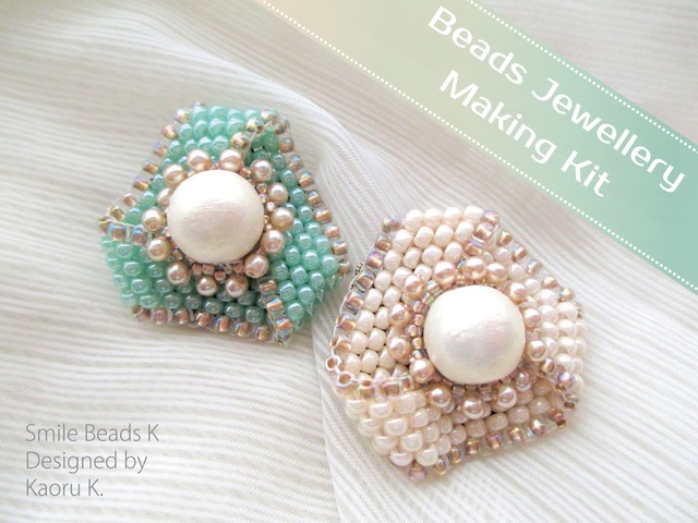 ※本品は、キット商品です。 ※お色は、ホワイト・グリーンの2色です。 どちらかお好みの方をお選びいただき、ご注文下さい。 ペヨーテステッチで編んだ長いリボンを六角形に折りたたみ、 中央には、大粒コットンパール(12㎜)をあしらいます。 シンプルで上品なブローチです。 サイズ:直径約3.8㎝ カラー: グリーン 技法:ペヨーテ ペヨーテステッチを数回経験された方対象です。 《封入物》 コットンパール・丸大・丸小・樹脂パール・ブローチ台・レシピ ※ステッチ針・糸は入っておりません