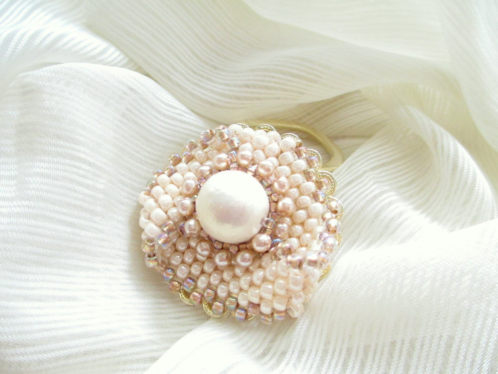 優しい光沢のある生成りシードビーズを飾りつけました。