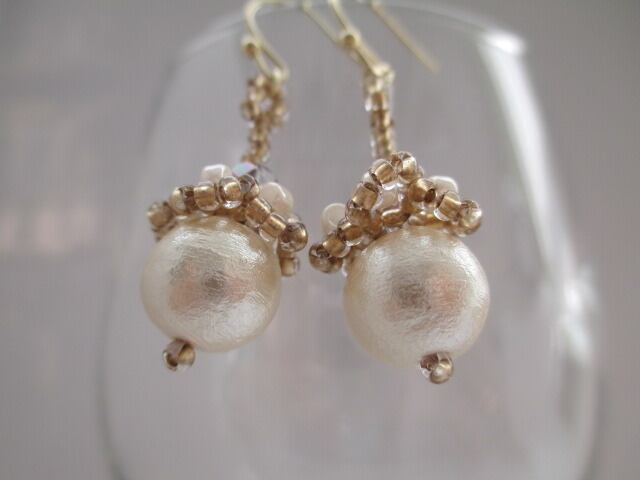 金ラインの丸小ビーズでレース風に編み上げ、FPをトップに華やかなピアスとなっております。