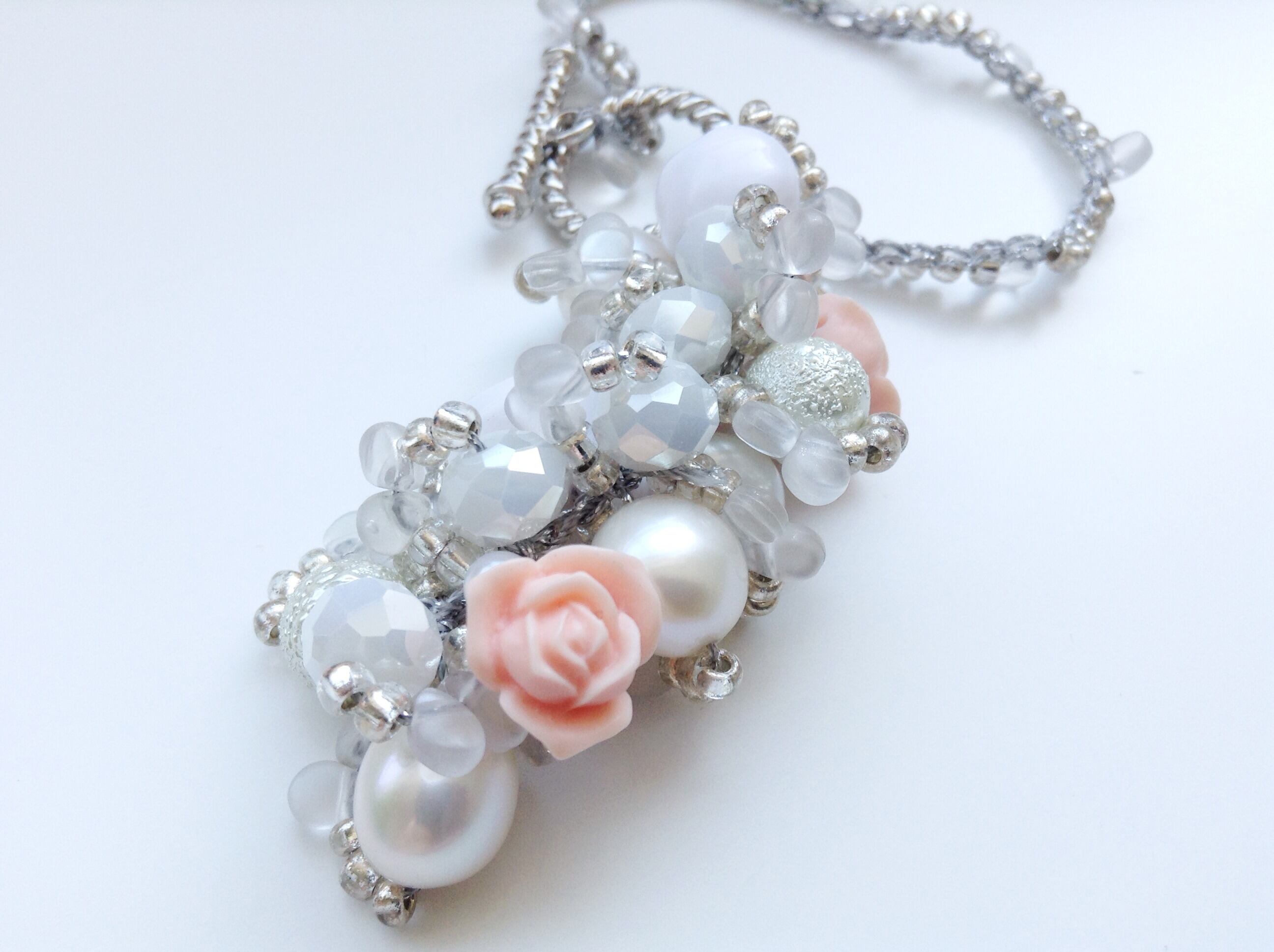 薔薇のモチーフに、淡水パールやシュガービーズなど様々なビーズで