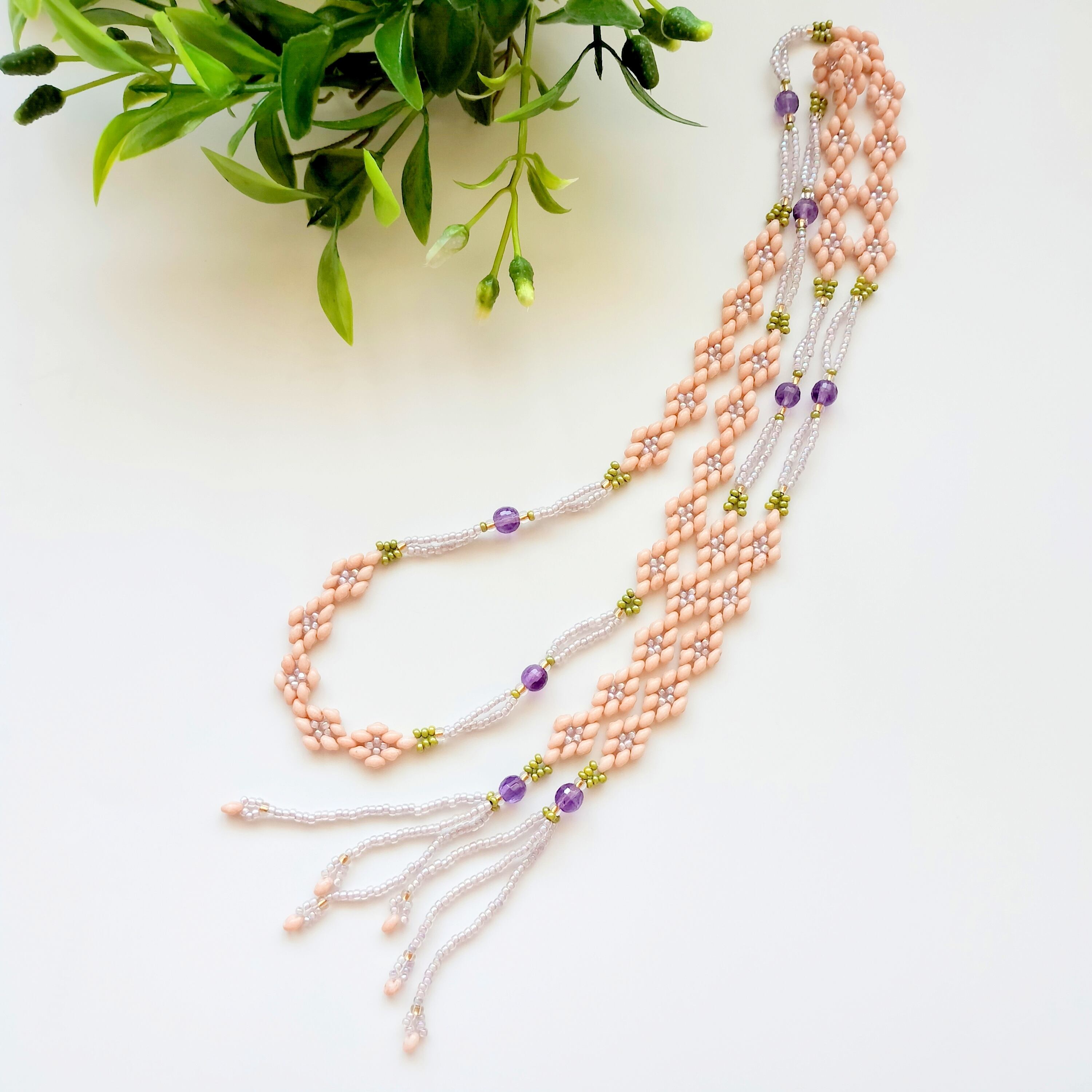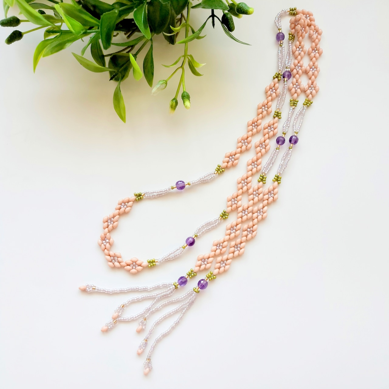 淡いピンク色の2ホールビーズを使ったラリエットです。